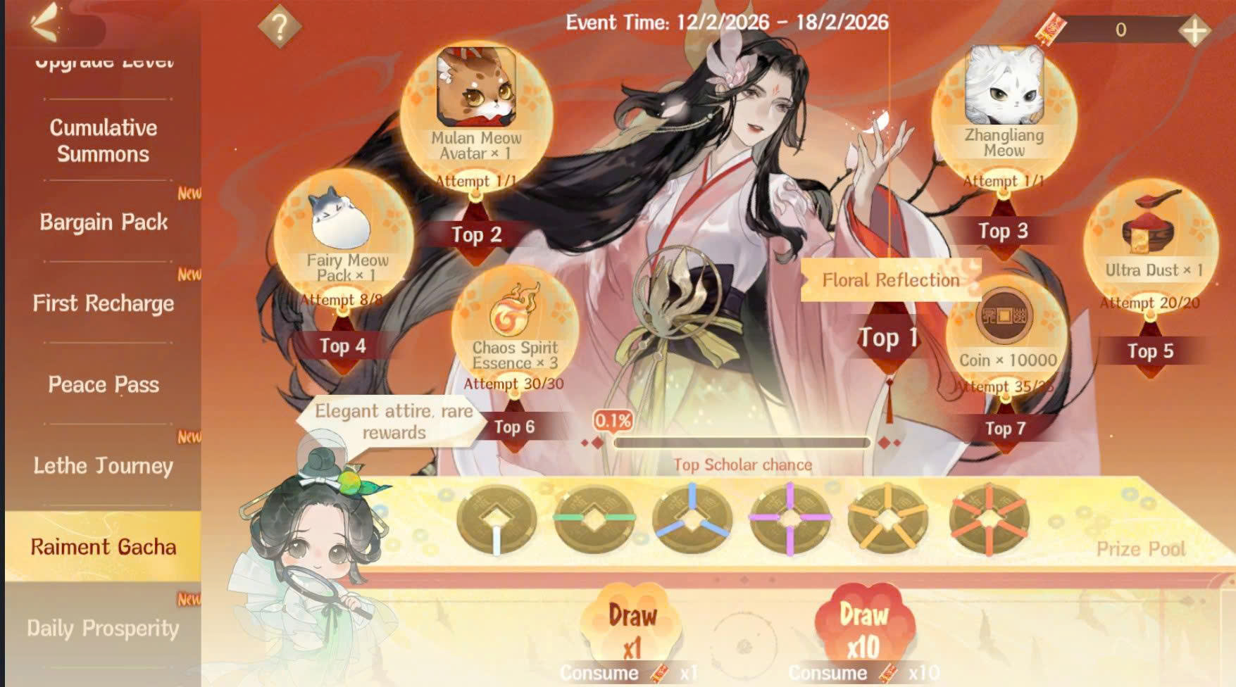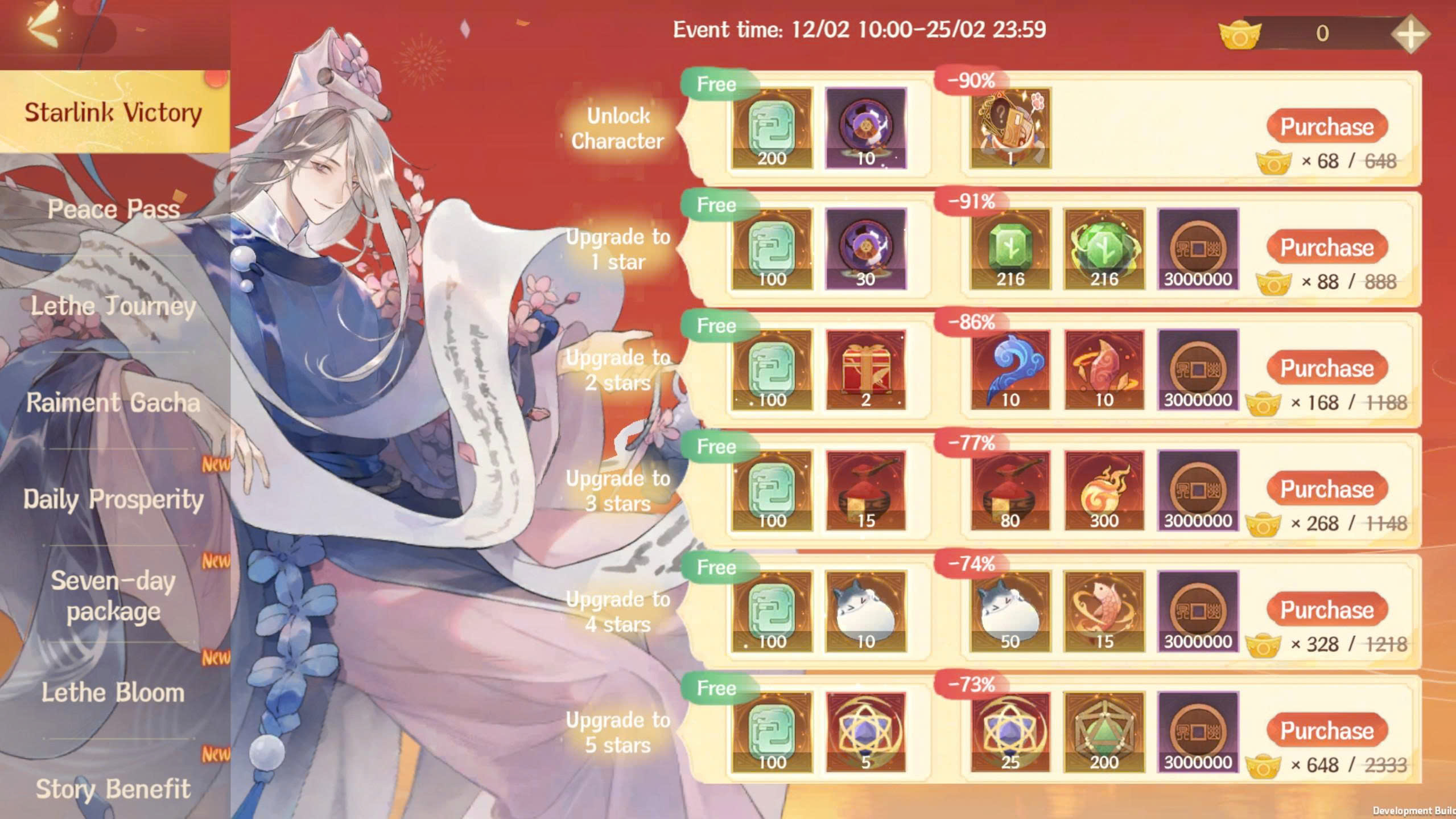 คำอธิบายกติกา: ในช่วงเวลากิจกรรม หลังจากอัญเชิญวีรชนตามที่กำหนดและทำการอัปเกรดดาวแล้ว ท่านทูตจะสามารถรับรางวัลฟรีได้ เช่น หยก, แพ็คเซียนเหมียว, บอลเหมียวปลูกฝัง เป็นต้น นอกจากนี้ ท่านทูตยังสามารถปลดล็อกแพ็กทรัพยากรที่ซื้อด้วยทองในราคาสุดคุ้มได้อีกด้วย