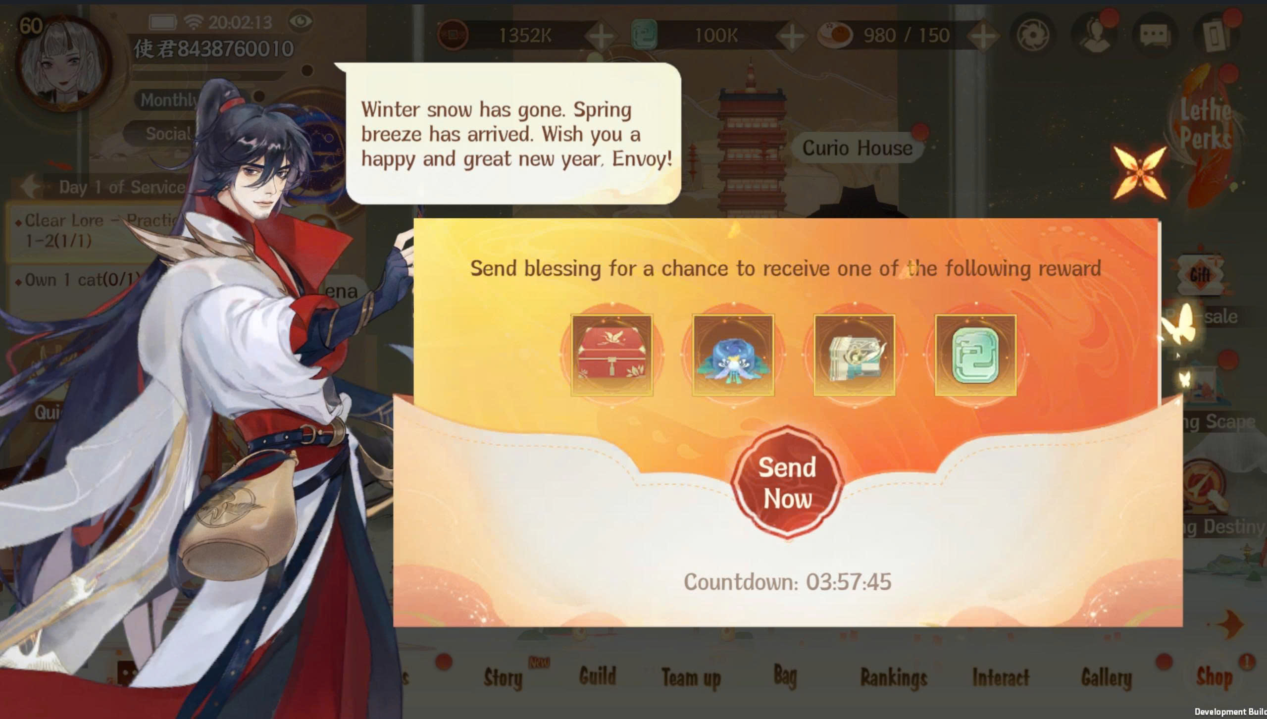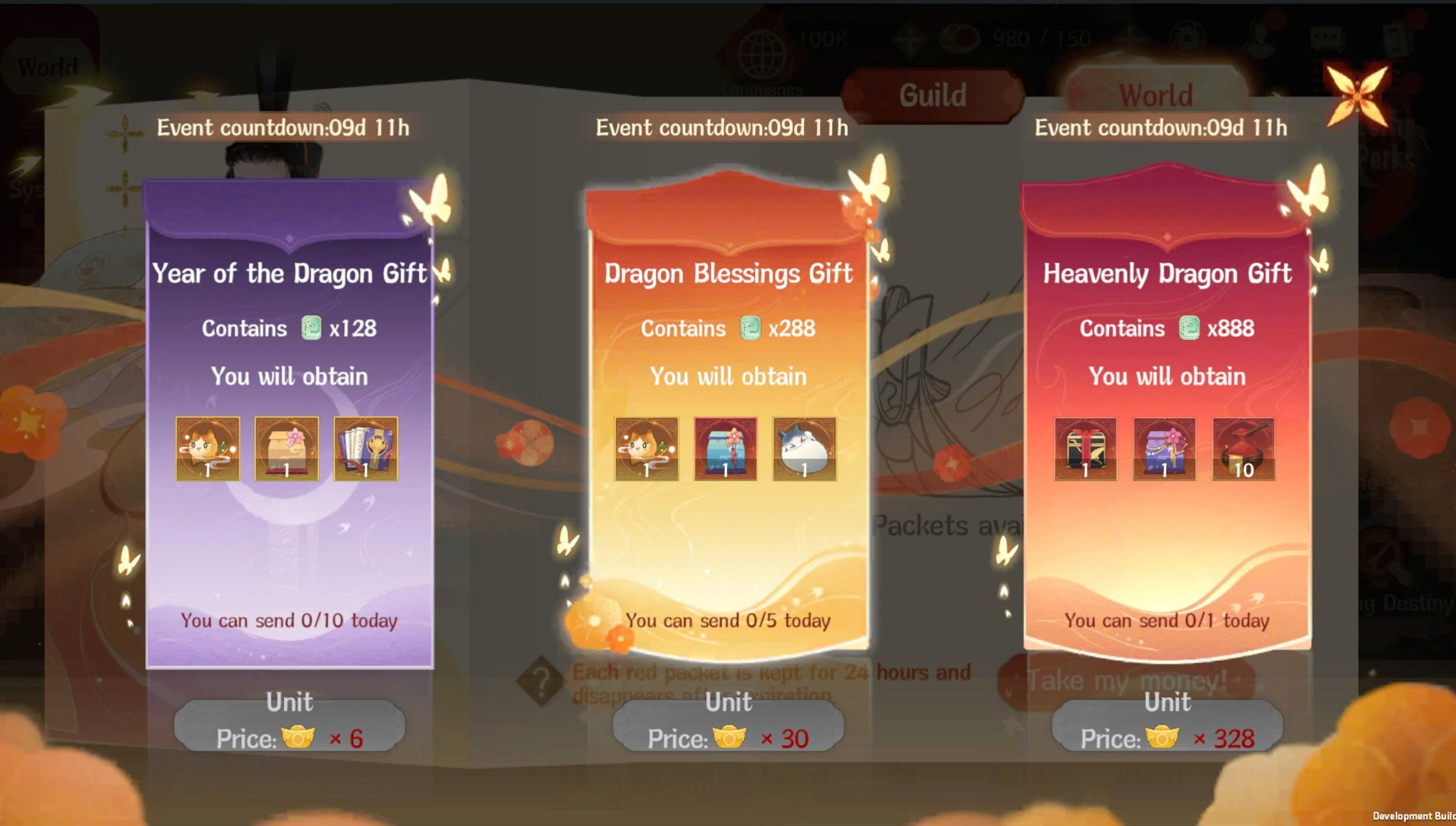 ในช่วงวันที่ 12 กุมภาพันธ์ – 25 กุมภาพันธ์, ระบบกอั่งเปาโลกจะเปิดให้ใช้งานเป็นเวลาจำกัด, ท่านทูตสามารถใช้ทองเพื่อซื้อกอั่งเปาโลกและเชิญท่านทูตทั่วโลกมาร่วมสนุก, เมื่อซื้อกอั่งเปาจะมีโอกาสได้รับเฟอร์นิเจอร์ลิมิเต็ดต้อนรับปีใหม่ ได้แก่ โคมปลาคาร์ปชมจันทร์, โคมหยกจ๋าวโฉงห้วน, พยัคฆ์สร้างแสง, ที่นั่งแท่นบัว.