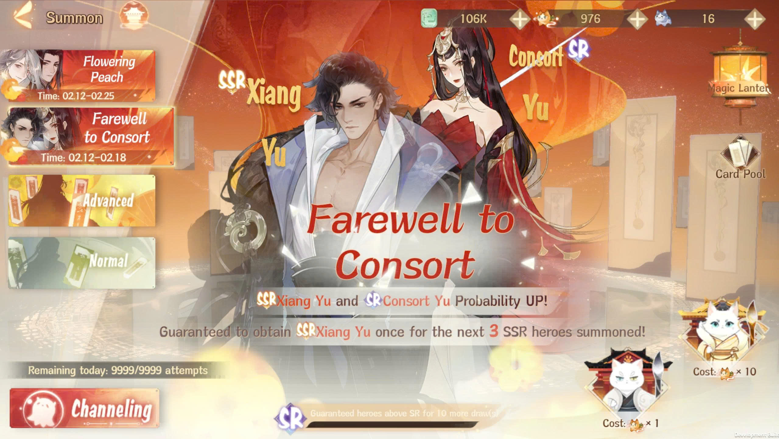 - เซี่ยงอวี่ มีโอกาส 30% จากจำนวนรวมของวีรชน SSR ในบ่อการ์ดนี้ และในการอัญเชิญที่ได้การ์ด SSR ครั้งที่ 3 จะได้รับ SSR อย่างแน่นอน