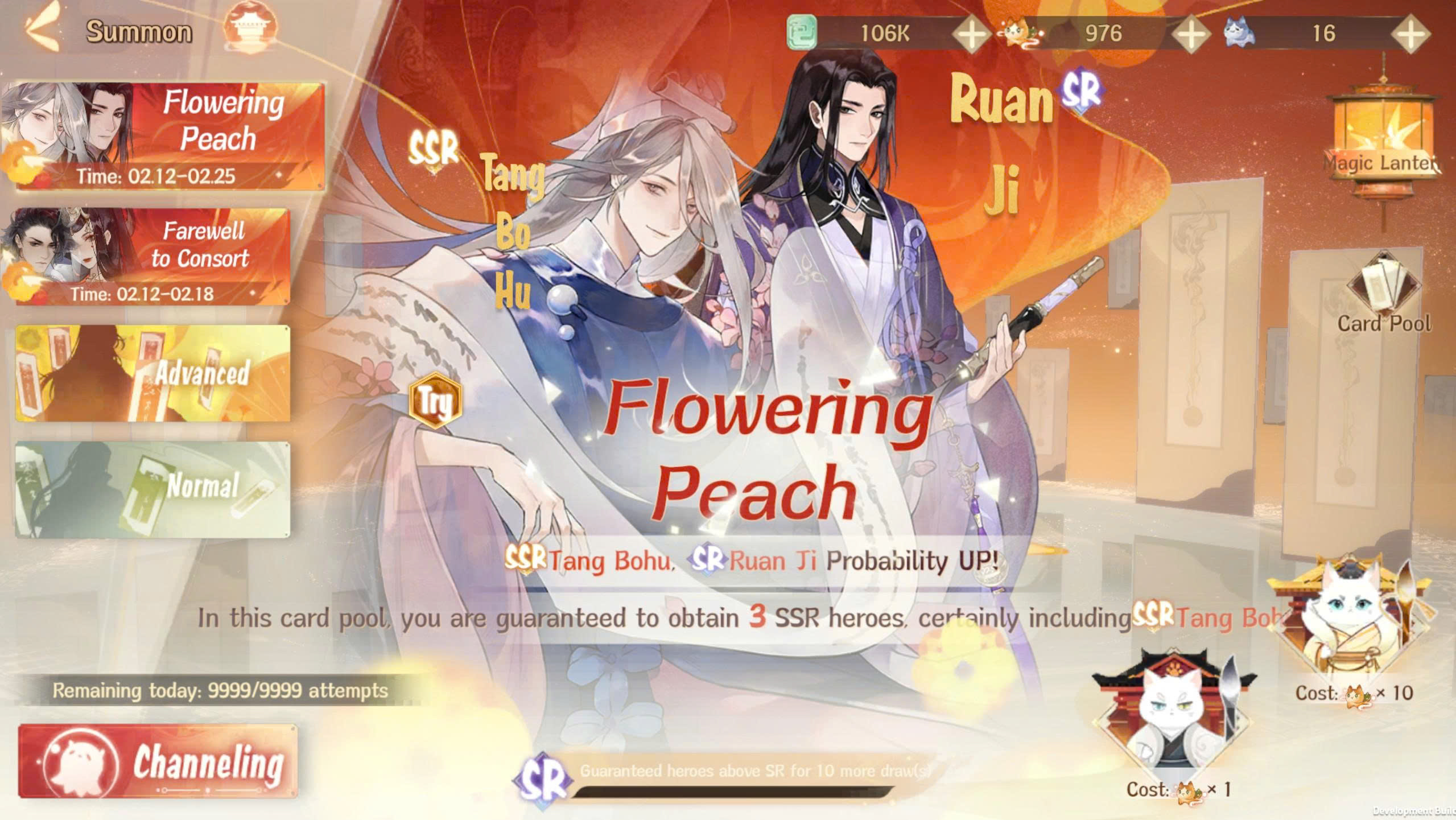 - ถังป๋อหู่ มีโอกาส 30% จากจำนวนรวมของวีรชน SSR ในบ่อการ์ดนี้ และในการอัญเชิญที่ได้การ์ด SSR ครั้งที่ 3 จะได้รับ SSR ถังป๋อหู่ อย่างแน่นอน