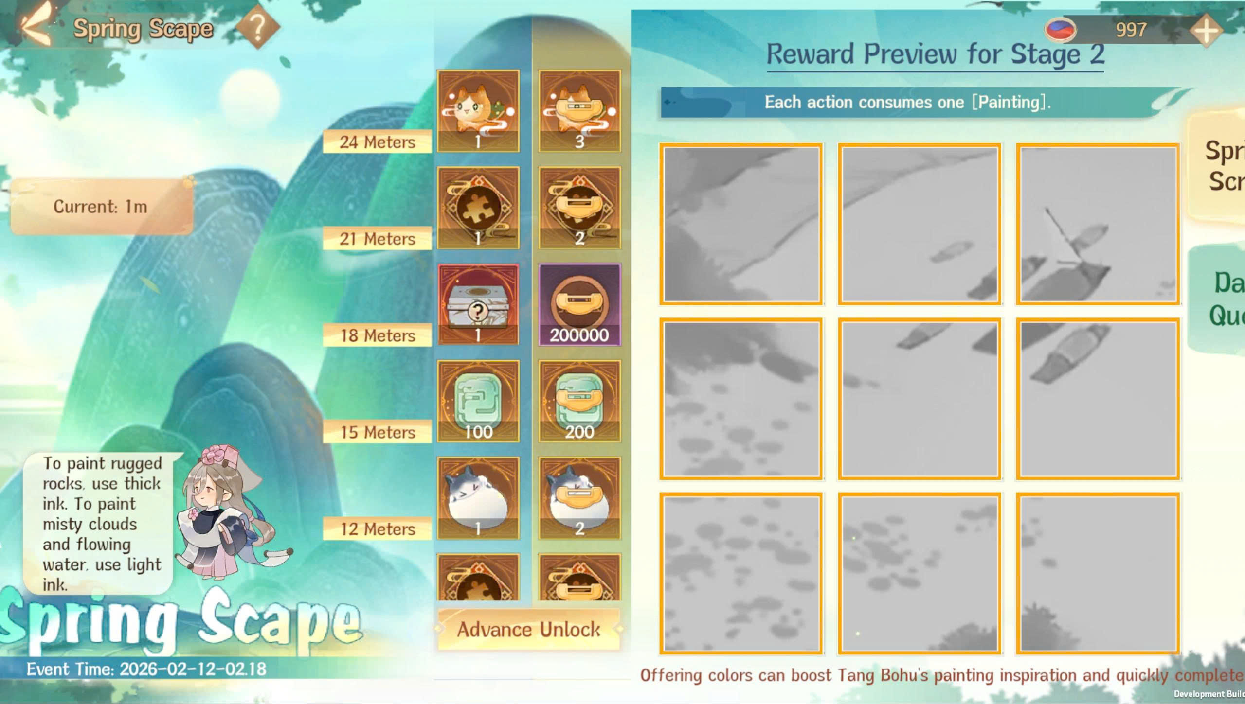 - ท่านทูตต้องนำทางถังป๋อหู่เพื่อสำรวจภูเขาและวาดภาพขุนเขาในฤดูใบไม้ผลิ สามารถคลิกที่พื้นที่ภูเขาด้านขวาของหน้าจอเพื่อเริ่มสำรวจภูเขาและทิวทัศน์ได้ ทุกครั้งที่เดินทางไปยังสถานที่ถ่ายภาพหนึ่งแห่ง จะใช้[สีชาดคราม] 1 ชิ้น และได้รับรางวัลพื้นฐานแบบสุ่มหนึ่งอย่าง หลังจากเดินทางไปยังสถานที่ถ่ายภาพครบเก้าแห่งเพื่อวาดภาพขุนเขาบางส่วนแล้ว จะต้องเริ่มสำรวจและวาดภาพขุนเขาในฤดูใบไม้ผลิใหม่อีกครั้ง