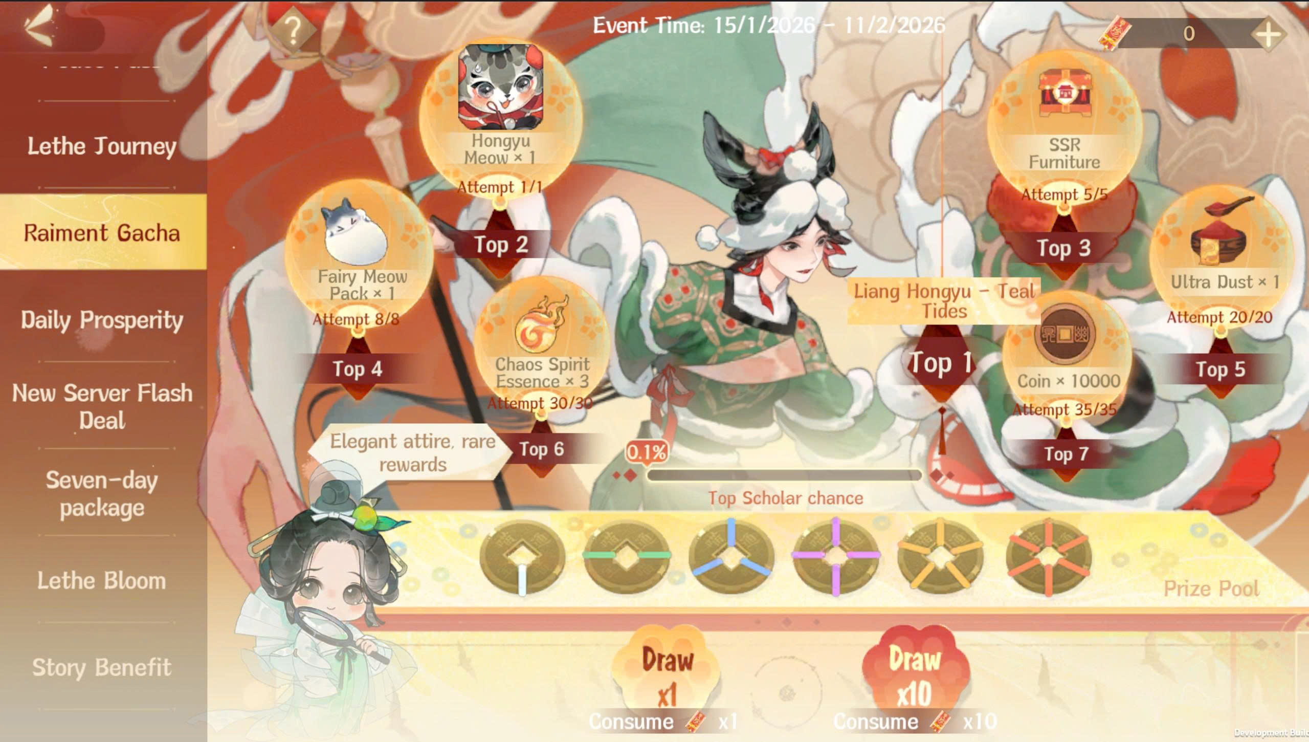 Dị An Ban Phúc: Trò chơi ở Vong Xuyên khác với trần gian, Dị An Cư Sĩ đã tăng ban phúc thêm cho Sứ Quân. Khi số lần tham gia tính năng, xác suất ném ra hình thái hiếm của Sứ Quân sẽ tăng. Phục Sức Trân Quý mỗi mức thưởng có giới hạn số lượng và xác suất ban đầu, sau khi rút xong mức thưởng này, xác suất của mức này sẽ phân bổ vào mức thưởng dư theo trọng số hiện tại, hình thái Tiền Xu, thưởng và xác suất hiện tại có thể tham khảo Chi Tiết Thưởng.