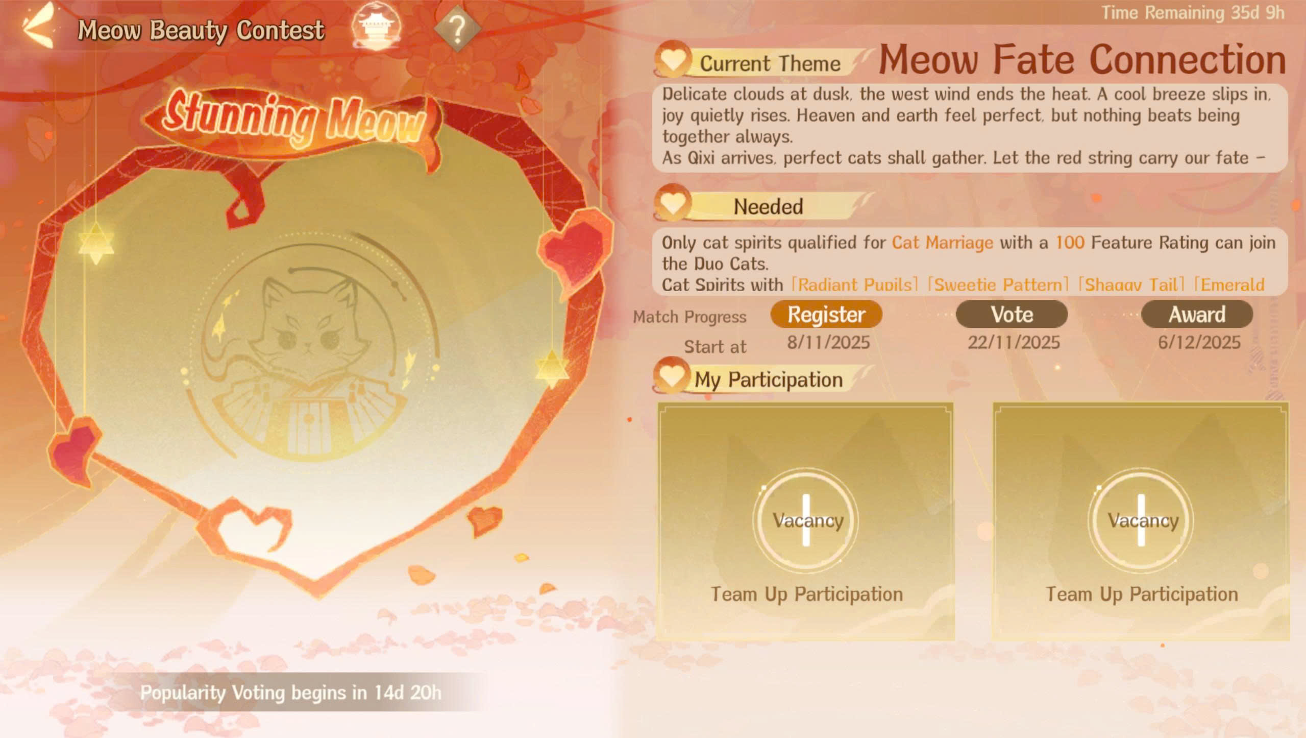 - Từ 10:00 08.11 đến 10:59:59 22.11.2025, là thời gian đăng ký. Trong giai đoạn này, tất cả Sứ Quân đều có thể bỏ phiếu cho các đội Hồn Mèo tham gia.