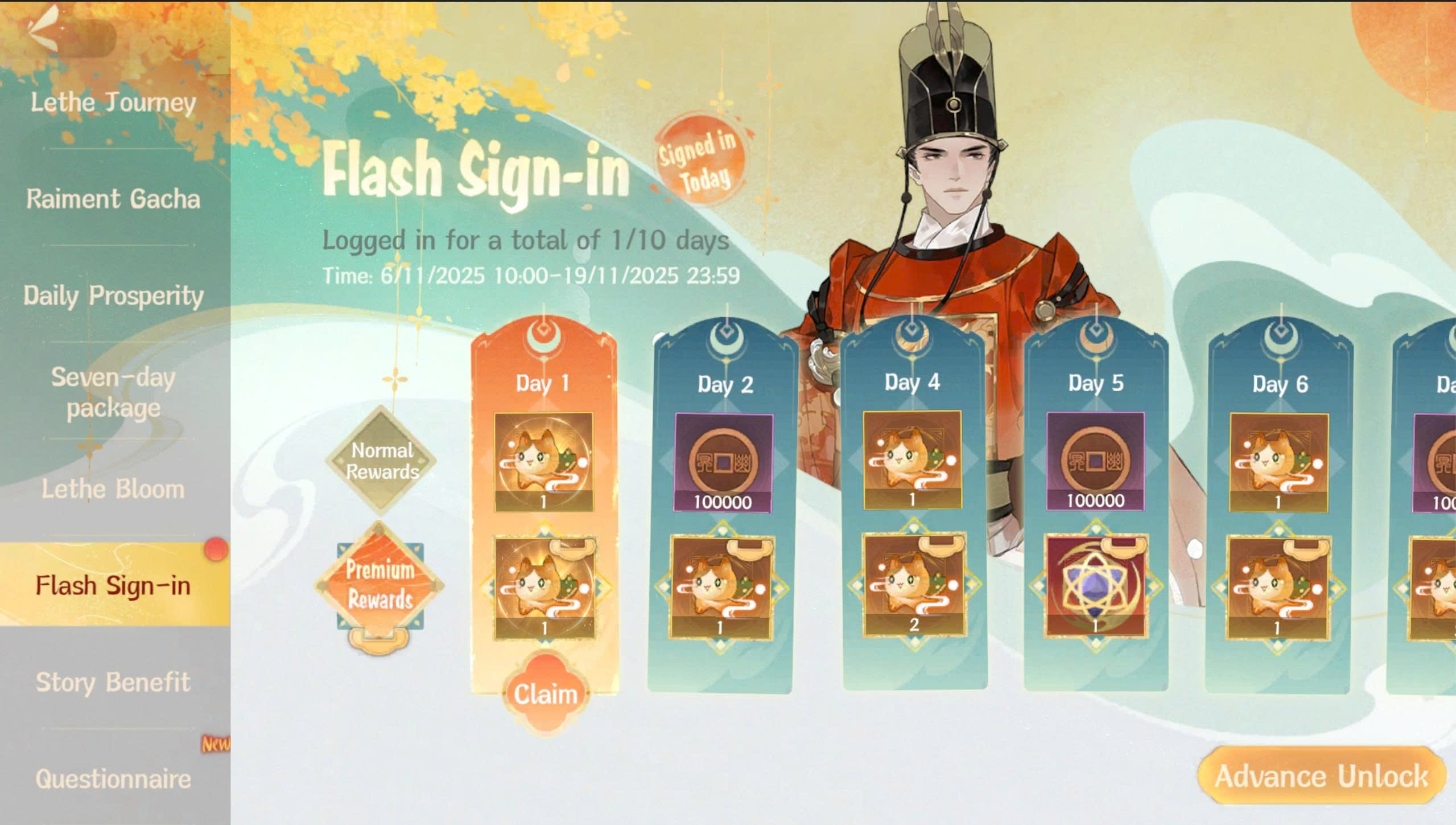 Giải thích quy tắc: Mục điểm danh chia thành 2 hạng Thường và Cao Cấp. Trong thời gian diễn ra sự kiện, khi đăng nhập tích lũy đạt đủ số ngày quy định, người chơi có thể trực tiếp nhận hoặc mở khóa thêm phần thưởng như Rối Miêu Linh, Tinh Dưỡng Miêu Cầu, Xu...